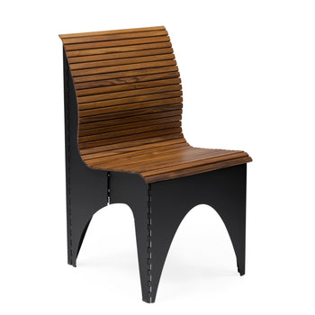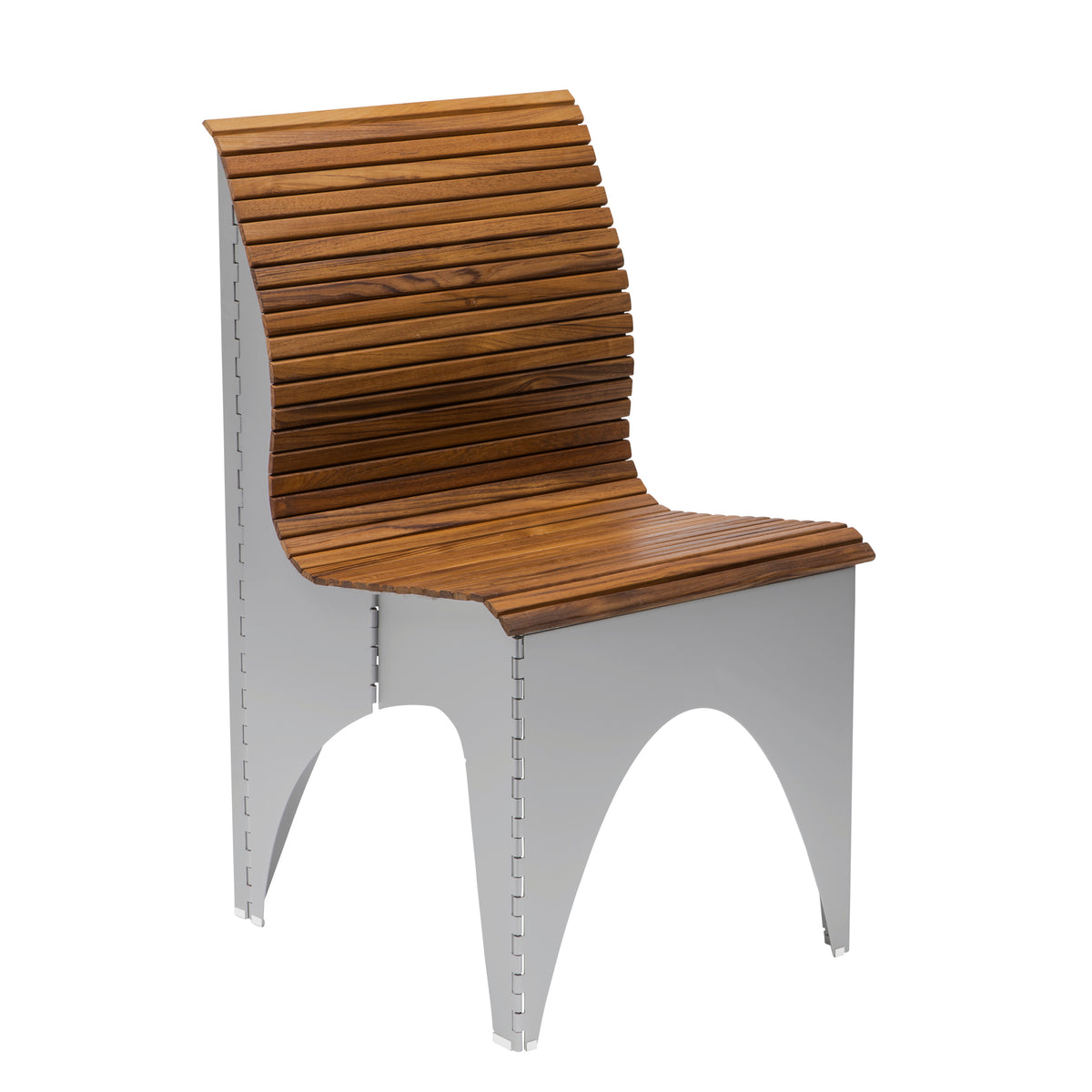 Its articulated aluminum sheet metal body relies on origami techniques developed for folding thick materials. The metal chair body is attached to a flexible wood seating surface (i.e., a tambour) giving the Ollie Chair its patented transformability.