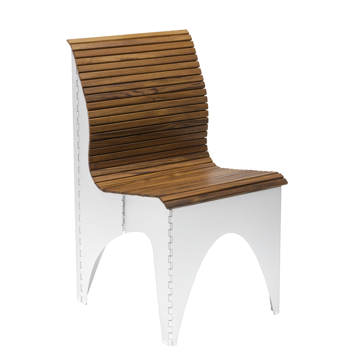 Its articulated aluminum sheet metal body relies on origami techniques developed for folding thick materials. The metal chair body is attached to a flexible wood seating surface (i.e., a tambour) giving the Ollie Chair its patented transformability.